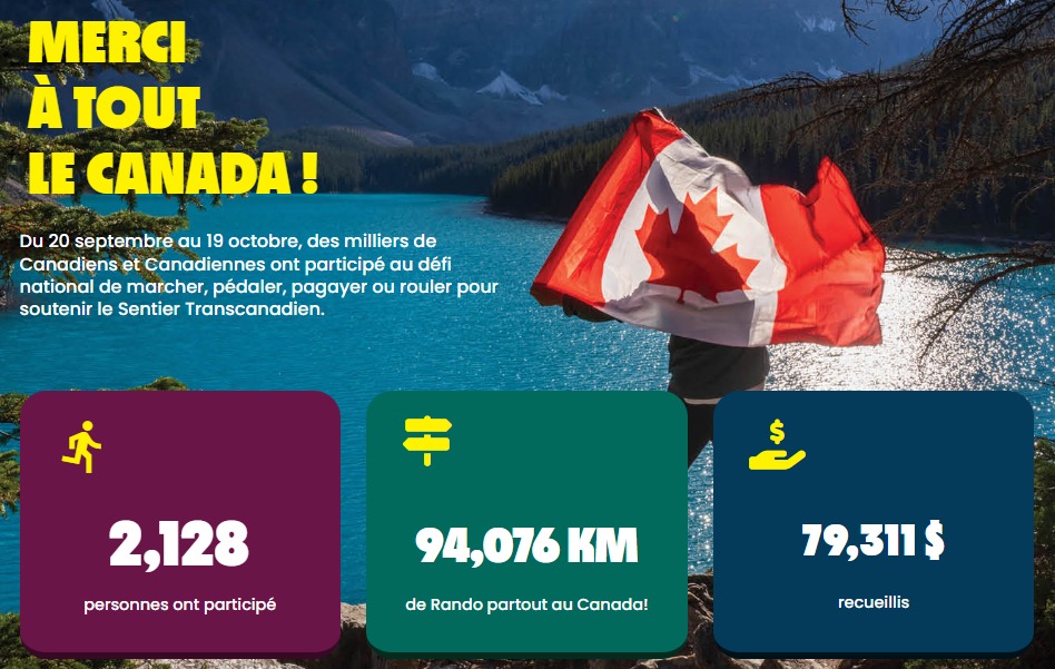 Un total de 2128 personnes à enregistrer plus de 94 000 kilomètres, ce qui a permis de recueillir plus de 100 000 $ pour soutenir le réseau de Sentier transcanadien.